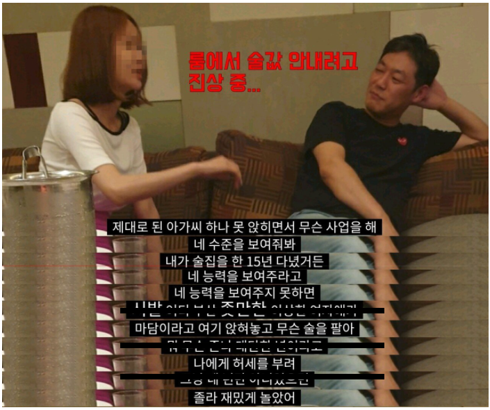 앞서 서사장TV는 김용호가 룸 술집에서 나눈 이야기가 담긴 녹취록을 폭로했는데요. 서사장TV가 공개한 녹취록에서 김용호는 룸 술집 15년 다녔다며 네 능력을 보여주라고 욕도 하고, 못생겼으면 진정성이라도 있으라고 막말을 합니다..