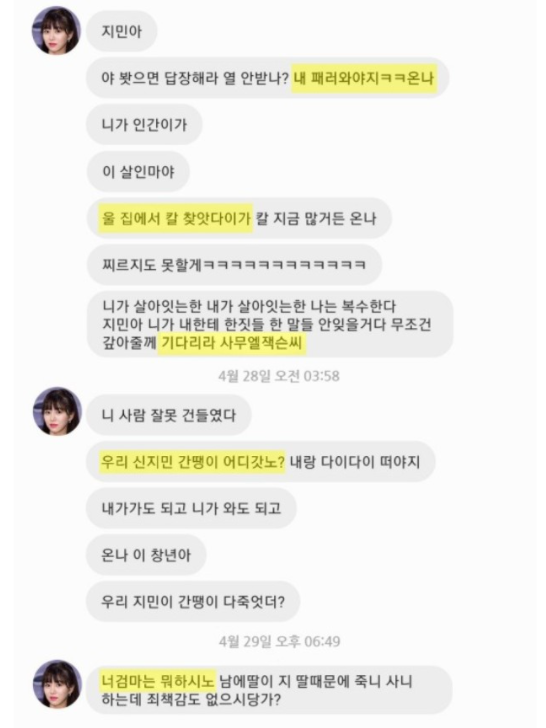 디스패치에 따르면 권민아는 지난해 11월부터 올해 5월까지 지민에게 폭언이 담긴 메시지를 보냈는데, 메시지에는 '지민아 내가 죽어도 답장 안할꺼가. 정신 차리라. 내 니 평생 못 잊는다', '네가 갑질한 거 그대로 나도 갚고 싶거든. 잘 참고 있다. 봤으면 답장해라. 열 안 받냐? 내 패러 와야지. 온나. 네가 인간이가?', '니 엄마도 전혀 죄책감 못 느끼나? 남에 딸이 매일 죽니 사니 원인이 지 딸인데' 등의 내용이 담겼습니다.