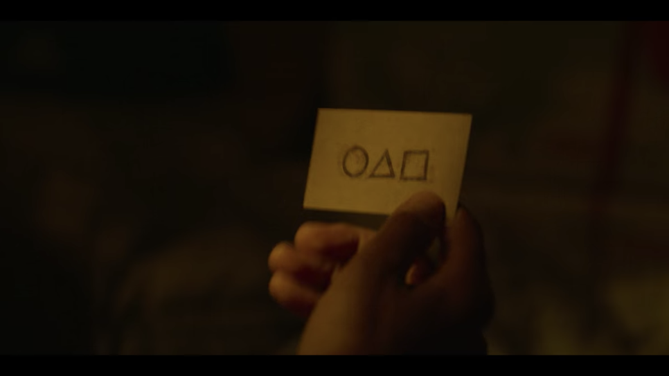 경마장에 성기훈을 잡으러 나타난 사채업자들의 협박에 못이겨 성기훈은 울며겨자먹기로 신체포기각서를 쓰게되고 지하철 플랫폼에서 우연히 만난 '양복남(공유 / 특별출연)'과 딱지치기를 하며 뺨까지 맞으면서 명함을 건네받게 됩니다. 그곳엔 오징어 게임 철자이자 약자인 동그라미, 세모, 네모가 그려져 있었습니다. ('○△□').