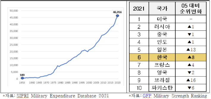 전국경제인연합회의 한국 방위산업 경쟁력 분석자료에 따르면, 한국의 국방비는 1953년 대비 2020년 약 244배 증가해 세계 10위 국가로 도약했습니다. 세계에서 가장 많은 국방비를 지출하는 미국과 비교하면 1953년에는 미국 군비 지출의 0.04%에 불과했지만, 2020년에는 미국의 6.01%로 증가했습니다.