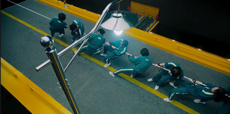 줄다리기 편에서는 장정만 10명인 상대편에 비해 노인과 여자 등 힘에서 불리한 사람들이 많은 기훈의 팀에서 게임을 하게 되지만, 오랜 연륜으로 엘리베이터를 타고 올라가는 동안 단순 힘으로만 싸우는 것이 아닌 전략적인 전술이 필요함을 가르쳐 승리하는 모습을 보여주는데요.
