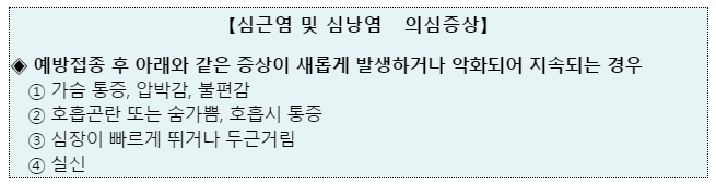 화이자, 모더나 백신 접종 후 심근염/심낭염 의심증상이 나타나면 신속히 의료기관 진료를 받도록 당부했는데요. 심근염 및 심낭염 의심증상은 다음과 같습니다.