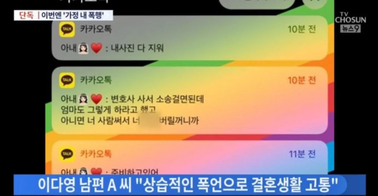 공개된 이다영의 카카오톡 메시지 등을 보면 이다영은 남편에게 “내 사진 다 지워. 변호사 사서 소송걸면 된대. 엄마도 그렇게 하라고 했고. 아니면 사람 써서 너 XX 버릴 거니까, 준비하고 있어” “꺼져버리고. 사진이랑 다 지우라고. 심장마비 와서 XX 버려라. 진짜로 너 같은 XX랑 살기 싫어. 이혼 소송 걸거야”라는 충격적인 내용이 담겨있습니다.